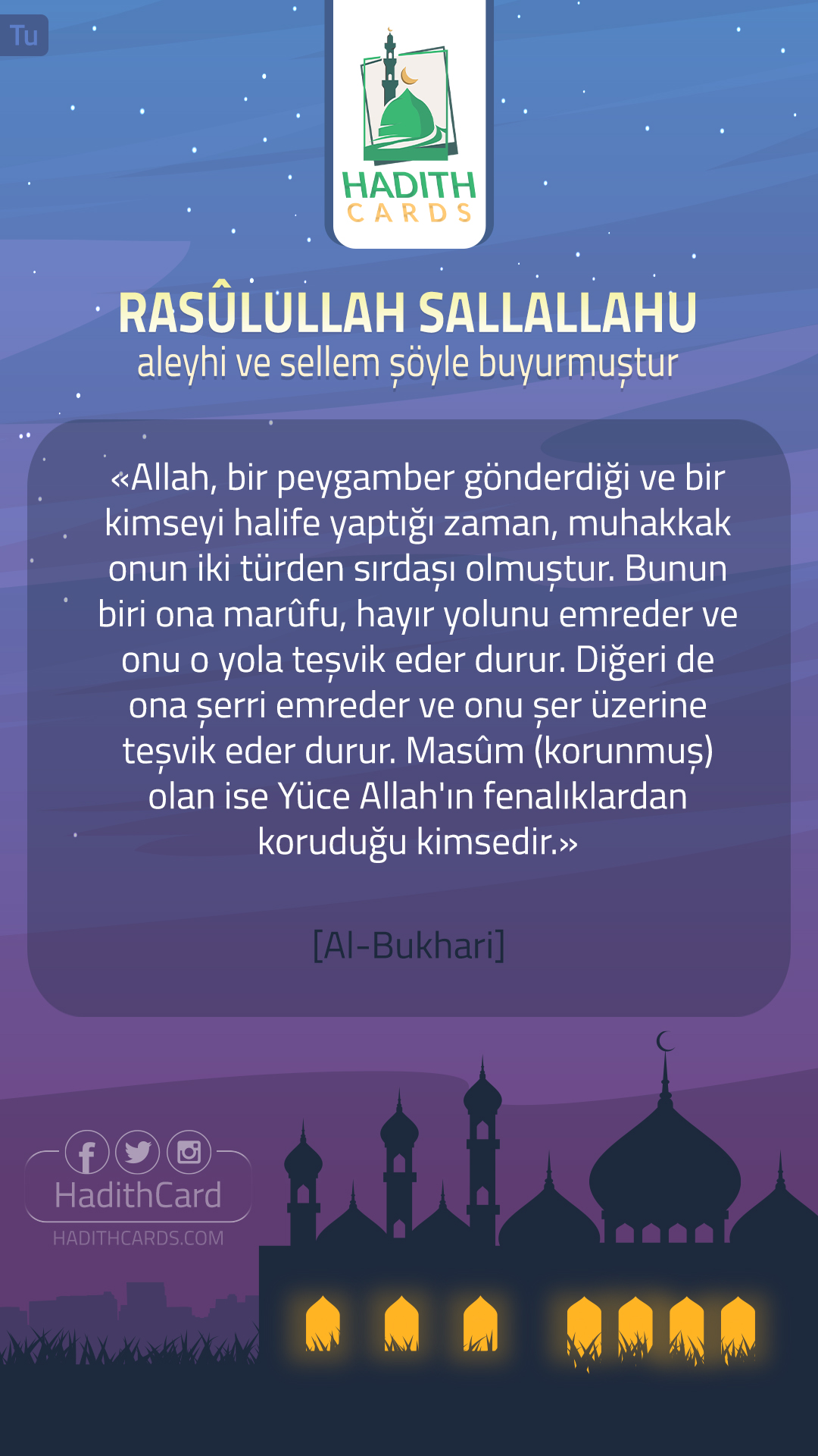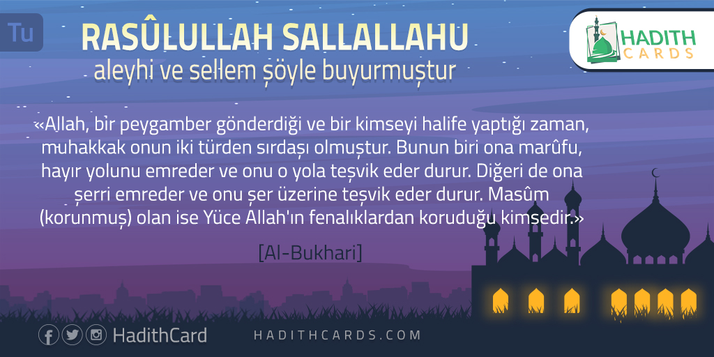 Allah, bir peygamber gönderdiği ve bir kimseyi halife yaptığı zaman, muhakkak onun iki türden sırdaşı olmuştur. Bunun biri ona marûfu, hayır yolunu emreder ve onu o yola teşvik eder durur. Diğeri de ona şerri emreder ve onu şer üzerine teşvik eder durur. Masûm (korunmuş) olan ise Yüce Allah'ın fenalıklardan koruduğu kimsedir